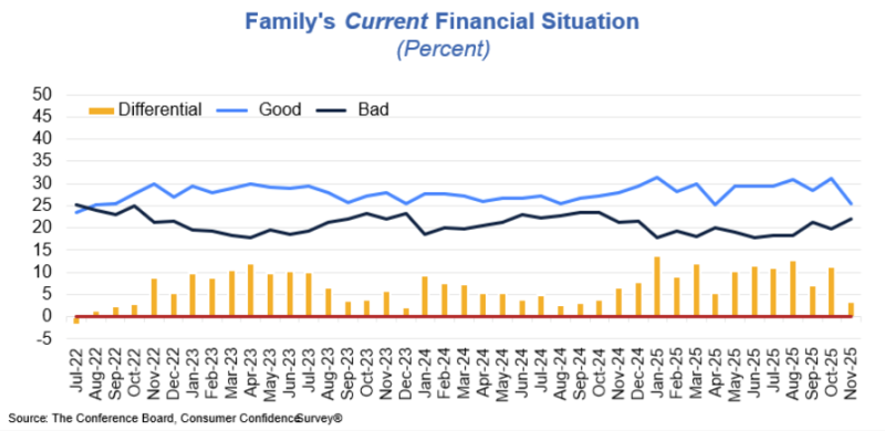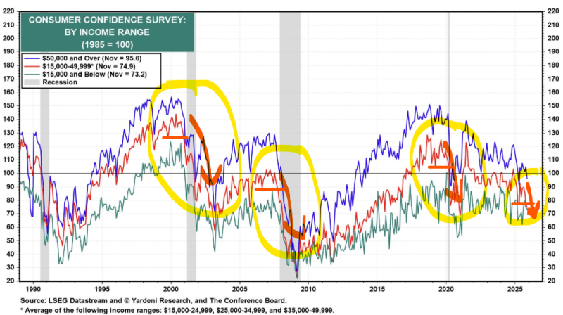 이번에는 소득 계층 별로 보죠. 소비자 심리의 중추는 중산층입니다. 위 차트의 빨간선이 중산층의 소비자 자신감이라고 볼 수 있는데... 가장 우측을 보면 최근 3개월 수치가 25년 4월의 전저점을 하향 돌파했습니다.
