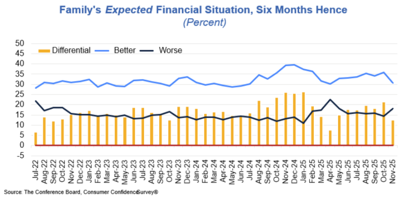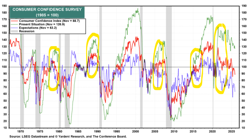 향후 6개월 뒤의 예상도 11월에 크게 악화되었습니다. 아니 11월에 뭔 일이 있었길래? 증시가 조정을 겪었죠. 잘 보면 25년 4월에도 급격히 예상이 부정적으로 선회했습니다. 현재 미국 증시가 소비자 심리에 얼마나 큰 영향을 미치는지 간접적으로 짐작해 볼 수 있겠습니다.