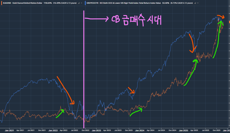 그런데, 22년 3분기 중앙은행 금 매수 시대가 시작된 이후로는 이러한 논리가 잘 동작하지 않고 있습니다. 보라선 이전까지는 정크본드가 급락하면 금 가격이 상승하는 패턴이 반복되어 왔지만, 중앙은행의 금 매입이 크게 증가한 이후로는 정크본드와 금 가격이 동반 상승하는 흐름이 이어지고 있죠.