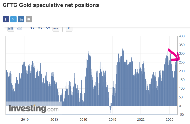 금에 대한 비상업적 포지션은 24년말 고점을 찍고 현재까지 고점이 낮아지고 있어요. 바로 앞 차트와 비교해 보면 중앙은행의 금 매입규모와 유사한 추세로 움직이는 경향이 있습니다.