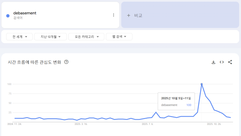 Debasement에 대한 세간의 관심도는 10월 초에 정점을 찍고 급속히 감소했습니다. 금 가격이 고점을 기록한 것도 10월 20일 경이죠. 이후 금 가격은 Debasement에 대한 관심도와 비슷하게 급락하다가, 최근 다시 강하게...
