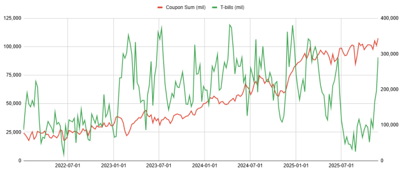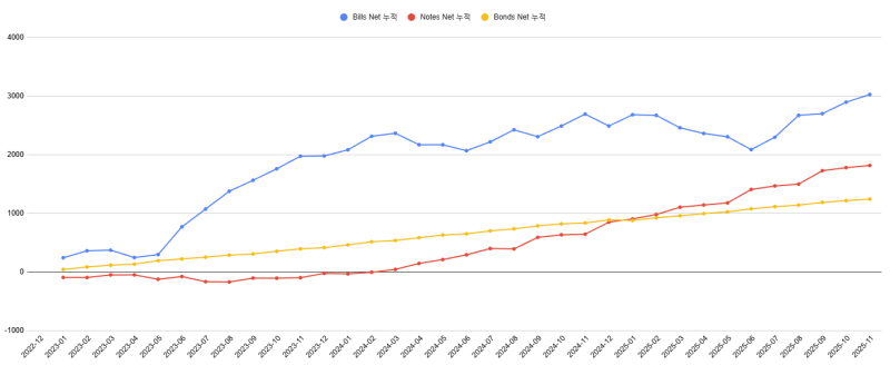위 차트의 파란선이 단기국채 T-bills의 누적 순발행 규모입니다. 보시다시피 크게 늘어나 있는 상태죠. 25년 하반기부터 빠르게 단기국채 발행이 늘었는데, 베센트의 말대로라면 이와 비슷한 추세가 앞으로도 약 1년은 이어질 수 있다는 이야기입니다.