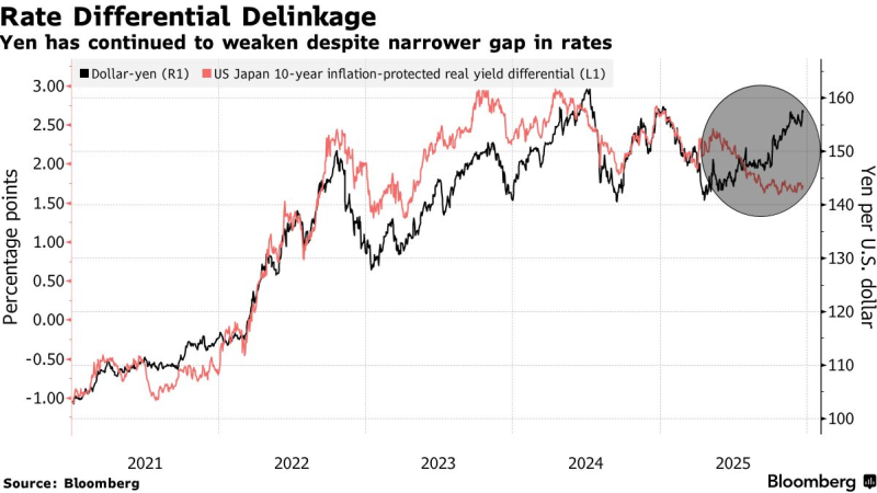 미국과 일본의 금리차 (빨간선) 가 더 이상 달러-엔 환율 (검은선) 을 설명하지 못하고 있습니다. 거의 반대로 움직이고 있네요. 금리차는 줄어들었는데, 오히려 엔은 달러 대비 약해졌다... 이건 앞서 이야기했던... 좁아진 금리차에도 불구하고 시장이 구조적 엔 약세에 대한 믿음을 버리지 않았음을 보여주는 대표적 사례가 됩니다. 이 상황에서 엔 캐리 청산이 대규모로 벌어질 가능성은 낮죠.