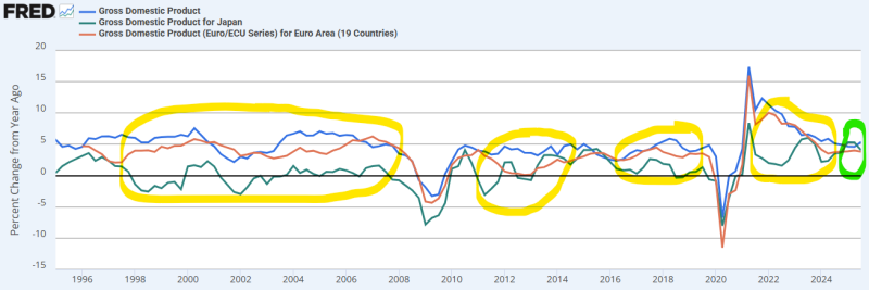그런데, 가장 우측의 초록 형광펜 구간을 보면... 일본의 성장률이 유로와 미국의 성장률과 거의 간극을 보이고 있지 않죠. 대략 24년 3분기 이후부터 성장률 스프레드는 상당히 좁아졌으니... 이는 24년 하반기부터 엔 캐리 동인은 약해졌다고 볼 수 있죠. 최근 엔 캐리 청산 공포가 시장을 휩쓸었을 때가 24년 8월 이었던 것은 단순한 우연이 아닌 겁니다.
