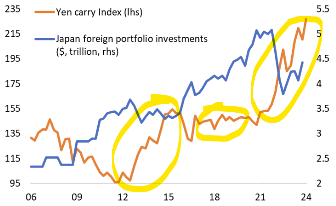 엔 캐리 규모 추정치에 기반해 만들어지는 엔 캐리 지수 (주황선) 를 보면 일본 국내와 국외의 성장 간극이 크면 상승하는 경향이 있어요.