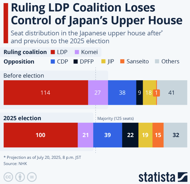 자민당 지지율이 낮아지자 의회의 구도도 흔들립니다. 자민당과 공명당은 연정을 이루어 과반을 차지해 왔는데, 이번 25년 중의원 선거에서 공명당과의 연정에도 불구하고 과반을 차지하지 못하게 되었습니다. 위 차트에서 보다시피 자민당 소속 의원 수가 급격히 줄었죠.
