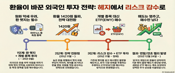 이 단계가 외국인의 환 헷지를 수반한 직접 노출 단계입니다. 이 단계에서 외국인은 1400원을 위협하는 원에 대한 불안도는 높지만, AI 포트폴리오에서 높은 변동성을 보여줄 한국 IDM 종목에 대한 노출은 늘리고 싶었다고 보여집니다. 그 결과... 환 헷지로 원 약세 리스크를 피하고, 환 헷지 비용을 감수하면서까지 삼성전자와 하이닉스 현물을 공격적으로 매수한 거죠.