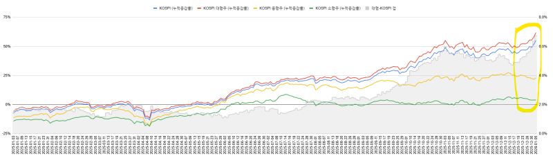 EWY는 코스피 지수의 대형주 비중이 실제 시총 비중보다 더 큰 편이라 EWY가 이렇게 급등하면 코스피의 대형주가 비대칭적인 상승압력을 받거든요. 그래서 앞서 살핀 것처럼 대형주 위주의 지수 랠리가 나오게 됩니다.