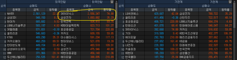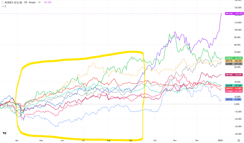 여기서 짚고 가야할 점... 4월~9월은 반도체가 하드캐리하는 시장이 아니었습니다. 오히려 반도체 섹터의 수익률보다 은행, 조선 등 다양한 섹터들이 아웃퍼폼하는 장세였죠. 섹터 별 가격으로 보면 반도체가 딱히 눈에 띄지는 않았지만, 종목으로 보면 두 IDM 종목의 외국인 매수 비중은 압도적입니다.