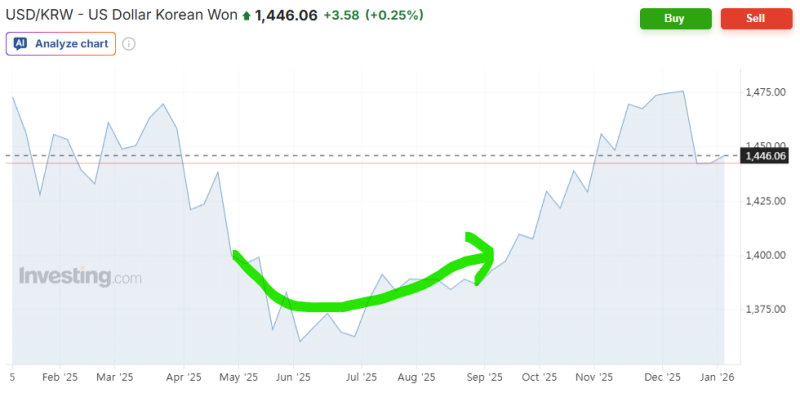 삼성전자와 하이닉스의 외국인 보유 비중이 분홍색 라인입니다. 보시는 것처럼 4월부터 9월까지 외국인 보유 비중이 급격히 늘어납니다. 만약, 외국인이 달러를 원으로 환전해서 두 종목의 비중을 늘렸다면, 달러 공급 up & 원 수요 up 으로 달러-원 환율은 빠르게 하락했어야 하죠.