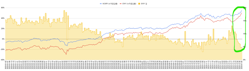 파란선이 코스피, 빨간선이 EWY. 가장 우측의 초록 형광펜 구간을 보면 코스피 상승세보다 EWY의 상승세가 훨씬 강합니다. 차트의 노란 영역이 두 지수의 스프레드인데 보시는 것처럼 매우 좁아져 있죠. 그만큼 EWY가 코스피보다 더욱 강하게 치고 올라온다는 의미입니다.
