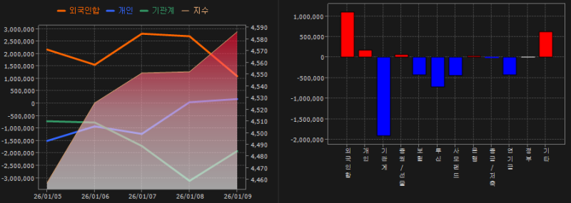1월 5일~9일까지 주체 별 순매수입니다. 외국인이 가장 큰 매수자였는데, 주말로 갈수록 순매수 규모는 점점 감소했죠. 개인은 주초 매도 이후 일주일 동안 거의 매수를 유지해 왔죠. 반대로 매도는 기관에서 주로 나왔습니다.