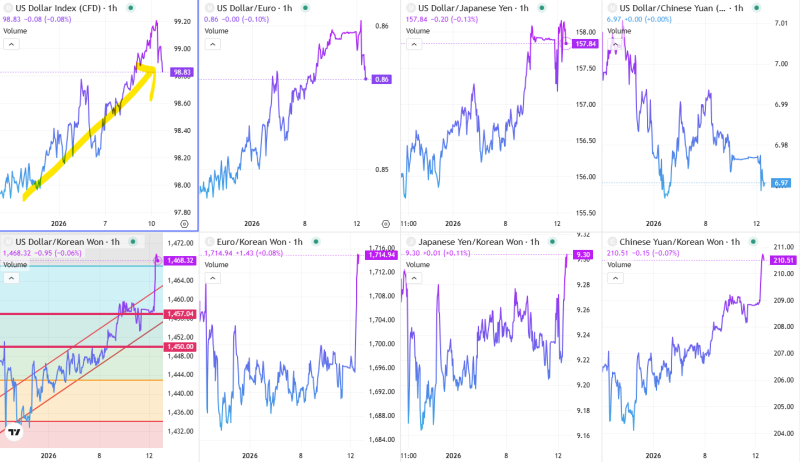 달러-원 환율이 급등했습니다. 1470원에 육박하는 수준까지 단숨에 치고 올라갔죠. 좌측 상단 달러 인덱스를 보면 26년 들어서며 지속적으로 강세를 유지하고 있습니다. 유로, 엔, 원은 약세로 몰려가고 있죠. 특이한 점이라면 우측 상단의 위안은 오히려 달러 대비 강세를 보이고 있다는 점입니다.