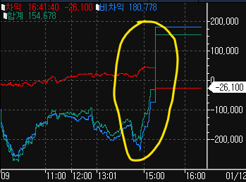 대략 2시 20분경부터 지수가 급격히 하락합니다. 같은 시간 외국인과 금융투자의 현물 매도가 나오죠. 가장 우측을 보면 프로그램 비차익 역시 2시 20분을 기점으로 매도가 나옵니다. 세 주체가 동시에 매도에 들어가자 지수는 매우 민감하게 반응하며 급락합니다.