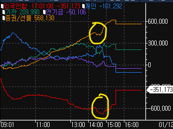 그리고는 30분만에 외국인, 금투, 프로그램 비차익 모두 매수로 돌아섭니다. 특히, 프로그램 비차익이 가장 적극적으로 매수로 돌아서죠.