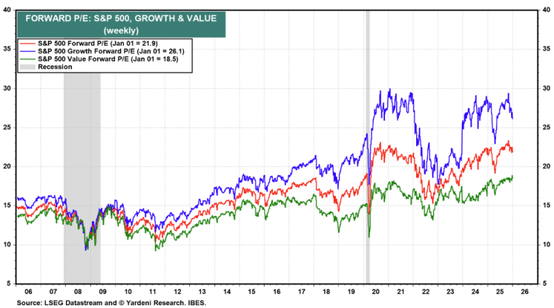 S&P500의 선행 P/E는 약 22x 입니다. 그런데, 성장주와 가치주로 나눠서 보면... 성장주 밸류에이션은 26x에 달하고, 가치주 밸류에이션은 18x에 불과해요. 가치주의 가격 부담이 훨씬 덜한 거죠.