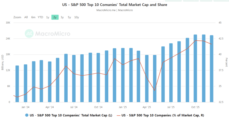 시총 top 10은 모두 테크 종목입니다. 이들의 시총이 워낙 급격하게 증가하면서 (파란 막대), 전체 시장에서 차지하는 비중도 계속해서 높아졌지만 (빨간선) 11월 이후부터는 top 10의 시총에 비해 시장 내 비중은 꽤 바르게 감소하고 있어요.