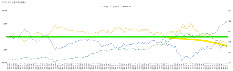 이후로도 금융투자의 코스피 현물 매수는 지속적으로 늘어났고, 그만큼 시장 중립을 위한 선물 매도 압력은 강해졌죠. 강해진 선물 매도압력으로 인해 외국인과 금융투자의 선물 수급이 만들어내던 균형점이 점점 하방으로 쏠리게 되었습니다. 그래서, 노란 형광펜 라인처럼 균형점이 점점 아래로 쏠려 내려오게 됩니다.