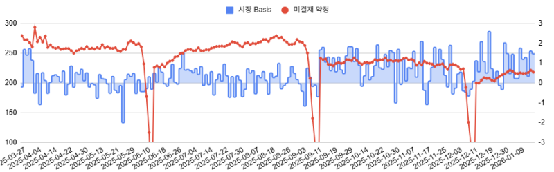 25년 10월... 1월 2주차 한국증시 수급 상황에서 이야기했죠? 금융투자가 공격적으로 코스피 현물을 매수하기 시작했던 시점입니다. 현물 보유량이 급격히 증가하면서 시장 중립을 유지하기 위해 금융투자는 선물을 매도해야 합니다. 그런데, 그 시점에 외국인 선물 대량 매도가 쏟아졌어요. 시장 조성자로서 금융투자는 외국인 선물 매도물량을 받아줘야 합니다.