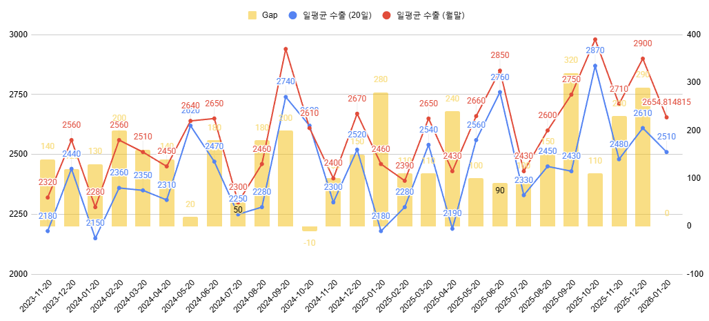 전체 일평균 수출액 추이는 빨간선입니다. 가장 우측의 소수점이 붙어있는 수치는 저의 1월말 기준 예상 일평균 수치구요. 이렇게 보면 한국의 일평균 수출은 등락은 있지만 꾸준히 우상향하고 있습니다. 파란선이 20일 기준 일평균 수출액의 추이인데 전반적인 추세는 월말 기준과 거의 동일합니다.