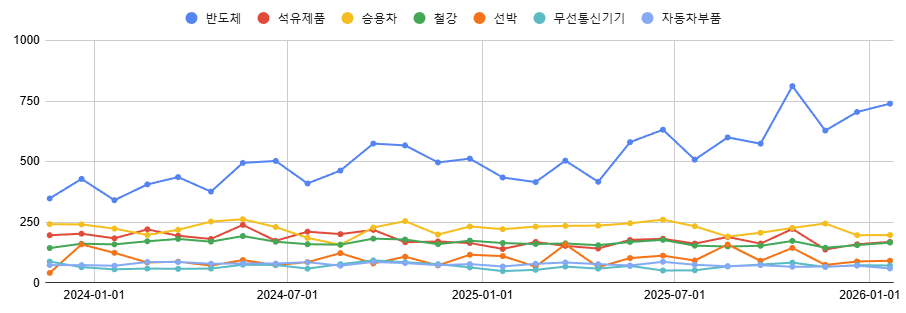 1월은 계절적으로 한국 수출이 가장 부진한 달이에요. 그런데도 불구하고 상당히 양호한 일평균 수출액을 20일 기준으로 기록했습니다. 양호한 기록의 최대 기여자는? 아시다시피 반도체입니다.