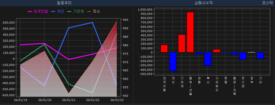 차이가 있다면 코스피는 미친듯한 급상승 궤적을 그리고 있고, 코스닥은 그에 비해 훨씬 겸손한 상승을 이어가고 있다는 정도? 외국인은 그래도 코스피는 사고 파는 모습이 보이지만, 코스닥에서는 거의 매도로 일관하고 있다는 정도?