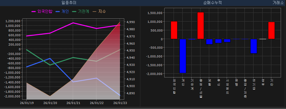 이번 1주일 동안 주체 별 누적 순매수. 우측을 보면 외국인도 대략 1조원 가량 순매수를 기록했고, 주중 거의 순매수를 유지했습니다. 하지만, 가장 강력한 매수 주체는 지난 주에 이어 또 다시 금융투자가 기록했죠. 순매수의 정반대에는 개인이 서 있습니다. 이번주만 대략 2조원을 순매도했네요.