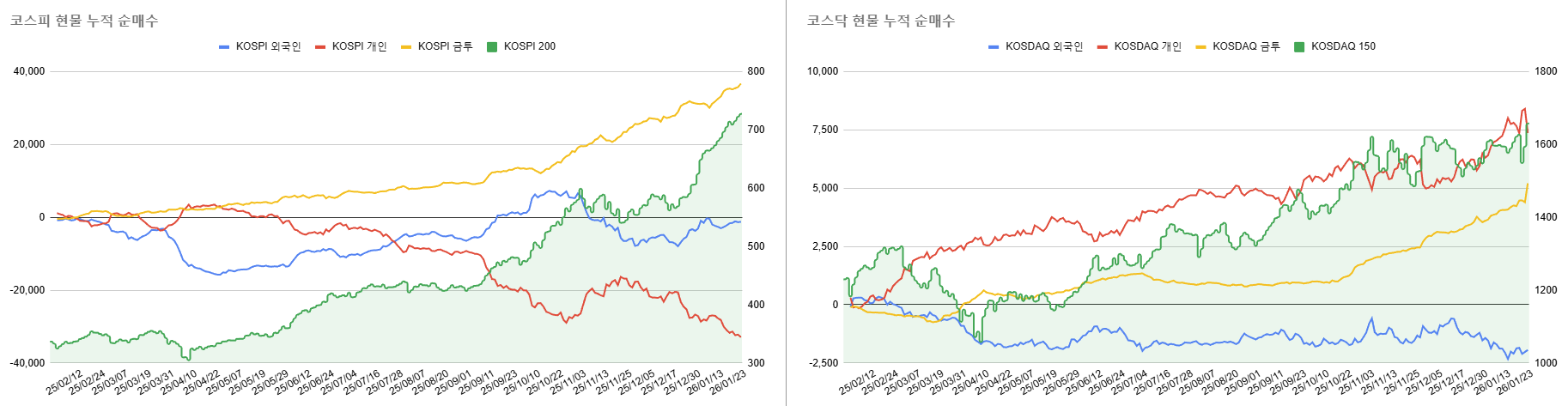 코스피와 코스닥, 주체 별 현물 누적 순매수 추이입니다. 파란선이 외국인, 빨간선이 개인, 노란선이 금융투자. 코스피는 그야말로 금융투자가 아틀라스처럼 혼자 떠받치고 있는 형국이고, 코스닥은 개인과 금융투자가 함께 떠받치고 있는 형국입니다. 반면, 외국인 누적 순매수는 지난 1년 코스피의 경우 거의 변하지 않았고, 코스닥은 매도 중인 상태죠.