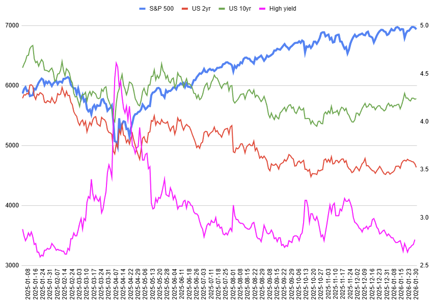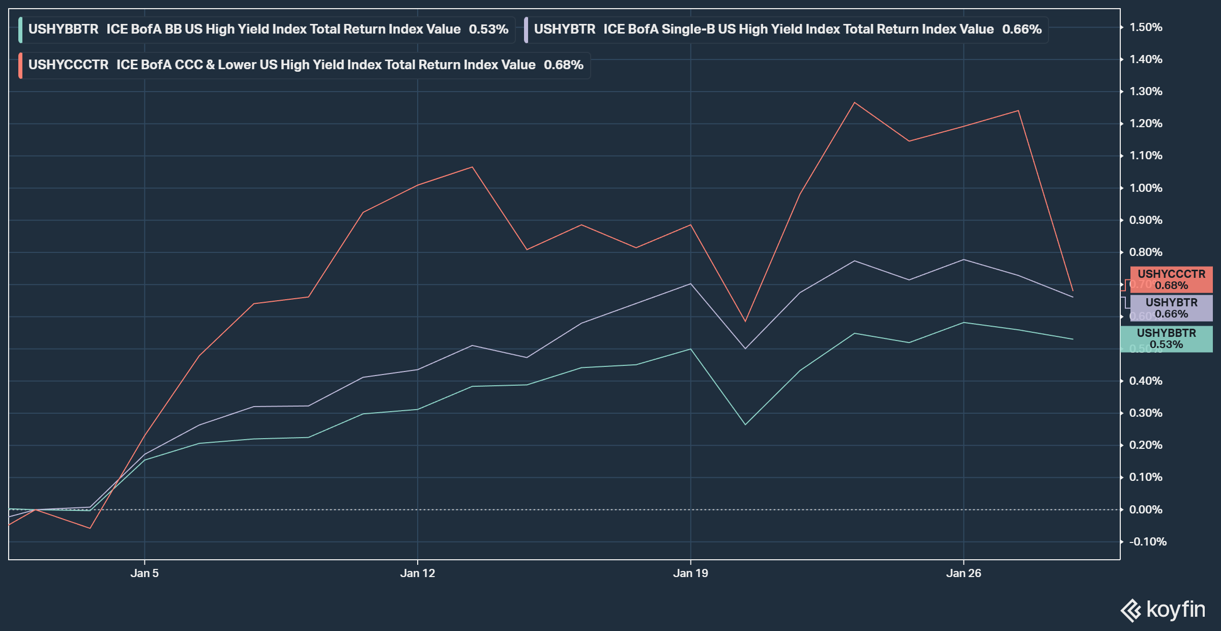 실제로 저신용 등급 회사채의 가격 추이를 보면 올해 초 리스크 온 심리가 강해지며 가장 신용도가 낮은 CCC등급 회사채가 튀어올랐지만, 이번 주에 들어서면서 급격히 꺾이고 있습니다. B, BB등급 회사채도 동반으로 꺾이고 있죠. 위험선호 심리가 이번 주에는 다소 누그러졌고, 그래서 하이일드 스프레드가 튀었구나... 라고 생각해 볼 수 있겠네요.