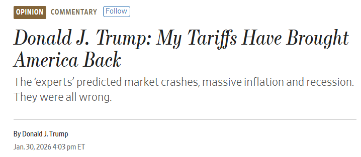 1월 30일, 트럼프가 직접 WSJ에 기고문을 올렸습니다. 내용은 뭐... 읽어볼 가치는 없어요. 처음부터 끝까지 자신이 세계 평화와 미국 번영을 가져왔다는 자화자찬 장광설입니다.