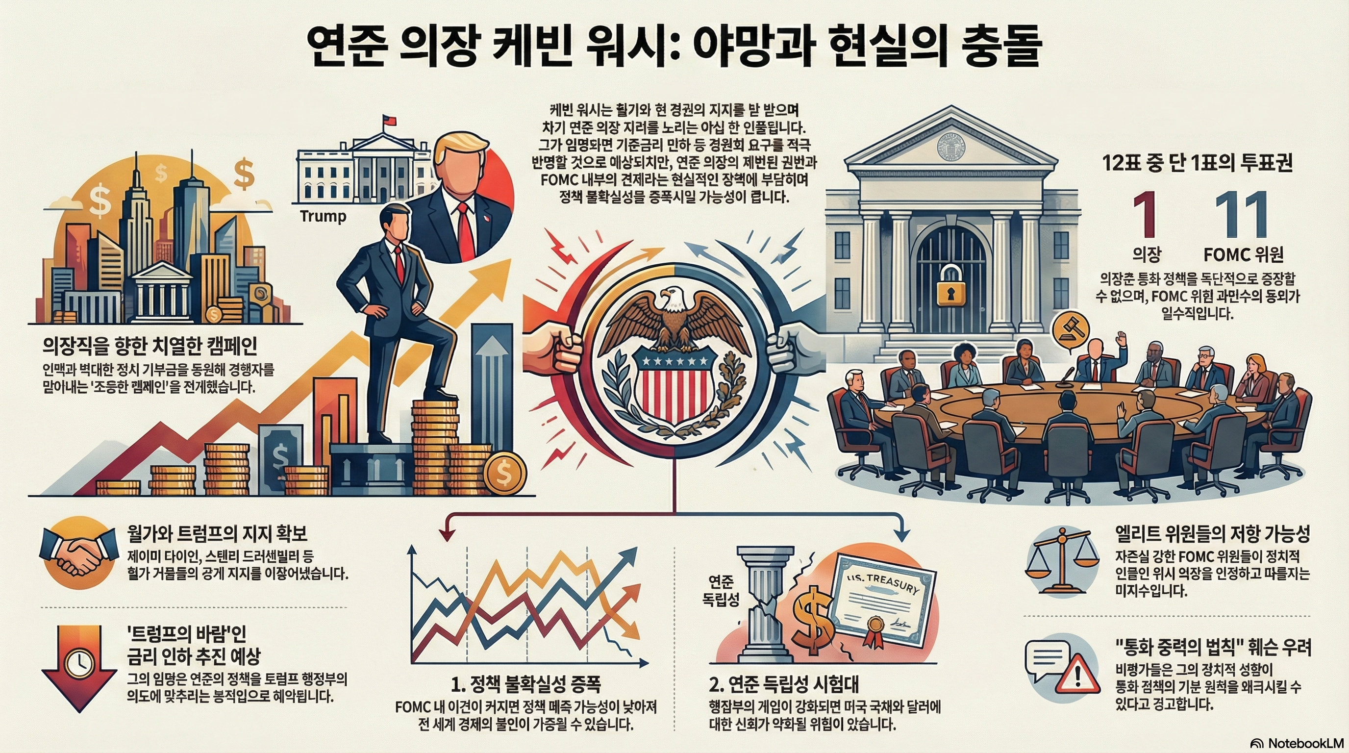 기사에서는 워시가 연준의장이 되기 위해 치열한 캠페인을 전개했다고 합니다. 다방면으로 인맥을 동원하고, 처가의 막대한 정치 기부금도 이용했습니다. 구체적으로 경쟁자인 케빈 헤셋을 밀어내기 위한 '조용한 캠페인' 을 상당히 적극적으로 펼쳐왔다고 합니다. 심지어 트럼프는 케빈 워시가 연준의장 자리를 너무 간절히 원한다는 점을 오히려 경계했다고 할 정도로 말이죠.