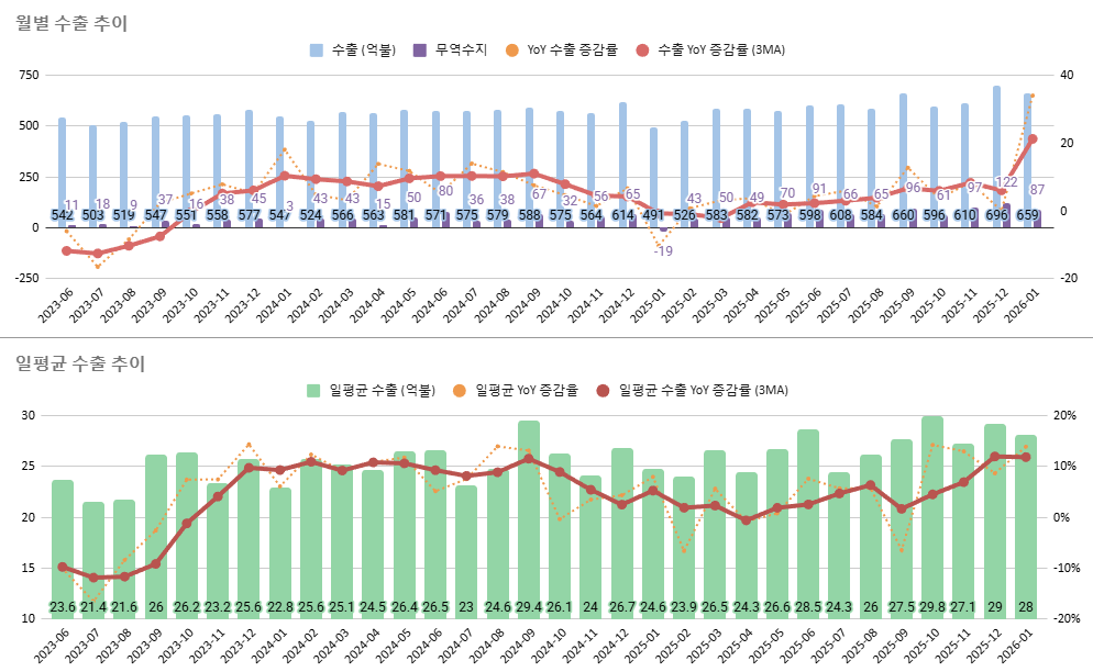 가장 중요한 하단의 일평균 수출을 보면 전체 수출액보다는 확실히 현황이 잘 보입니다. 예년 평균에 비해 이번 1월 일평균 수출은 좋았습니다. 하지만 전년 동월 대비 상승률은 그다지 드라마틱하지 않았죠. 하단의 빨간 라인이 YoY 상승률의 3개월 이평선인데 평탄화되었죠. 이는 일평균 수출의 상승세가 둔화되었다는 의미입니다. 실제로 1월의 일평균 수출액은 전월 대비 소폭 감소했죠?