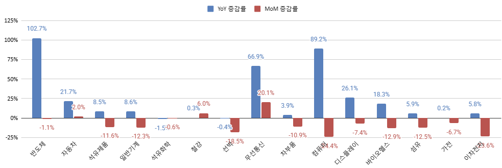 품목 별 상승률을 보면 파란 막대인 전년 동월 대비 상승률은 지난 해 1월 수출이 전반적으로 부진했기에 큰 의미는 없습니다. 전월 대비 상승률인 빨간 막대도 1월이 가장 계쩔적으로 수출이 부진한 달이니 마이너스의 비중이 높은 것도 납득이 갑니다.