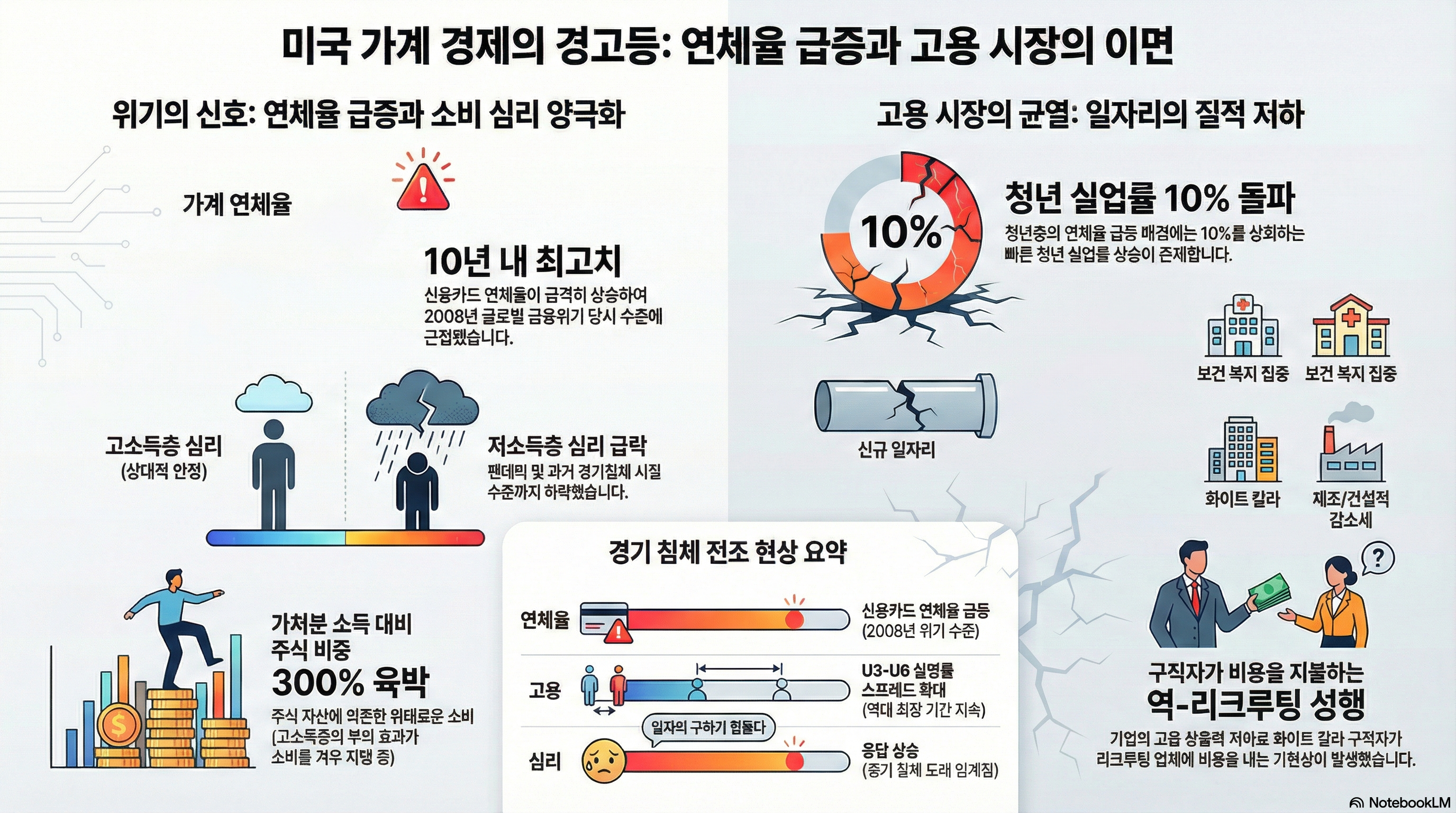 연체율을 연령대 별로 구분해 보면 보유자산과 소득이 적은 저연령층일수록 연체율이 급격히 높아지고 있습니다. 과거 추이를 보면 연체율이 높아질 때 항상 같은 패턴이 나타났음을 알 수 있죠. 또한, 지금의 연체율 상승세는 2008년에 비견될만큼 빠르게 치솟고 있습니다.
