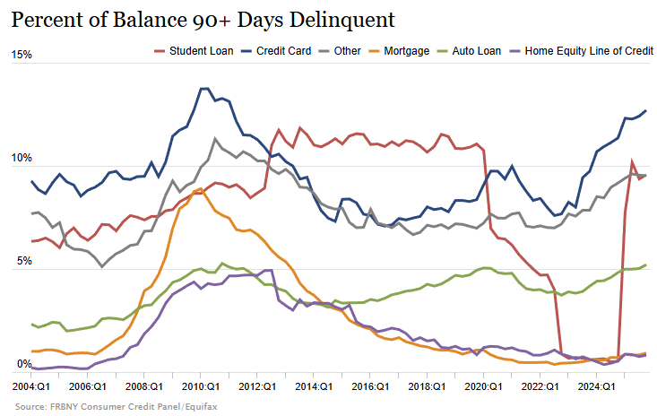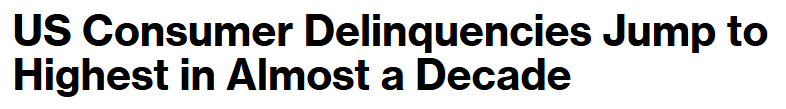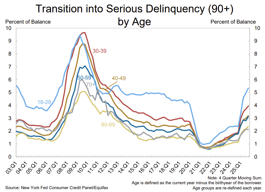 뉴욕 연준의 2025년 4분기 가계 신용 보고서가 발간되었습니다. 그리고, 그 내용은 상당히 좋지 않아요. 블룸버그 기사 제목대로 미국 소비자들의 연체율은 10년 내 최고치까지 상승했습니다.
