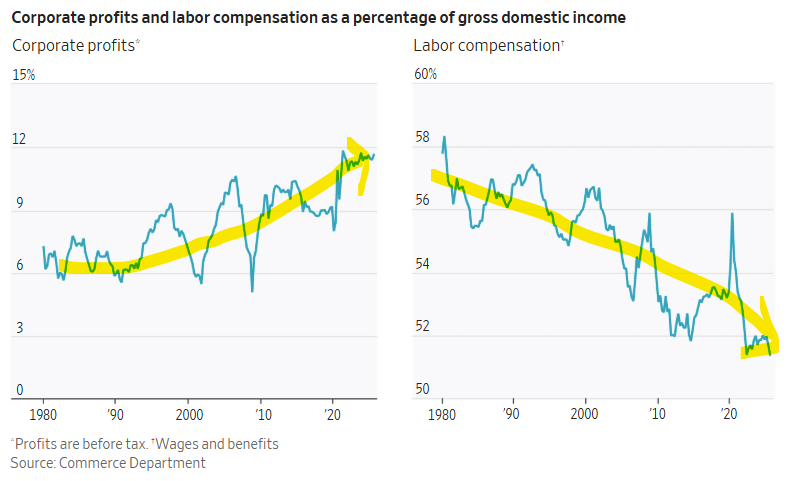 미국의 기업 이익은 꾸준한 상승세를 유지하고 있고, 반대로 임금은 꾸준히 하락세를 유지하고 있습니다. 미국의 부가 가계가 아닌 기업으로 더욱 많이 쏠려가고 있다는 거죠.