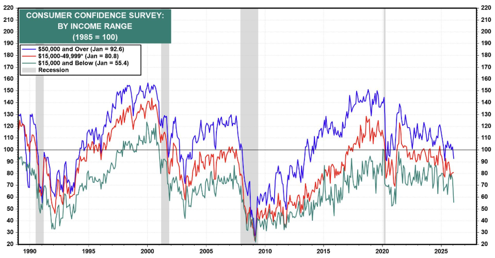 소득이 낮을수록 소비자 심리도 약하죠. 전반적으로 모든 계층에서 소비자 심리는 계속해서 하락하고 있지만, 유독 저소득층 (초록선) 의 소비자 신뢰지수는 급격히 하락하여, 현재 팬데믹 수준까지 하락한 상태입니다. 고소득층 (파란선) 의 심리는 어느 정도 버티고 있지만, 저소득층의 경우 과거 경기침체 시절과 유사할 정도의 흐름이죠.