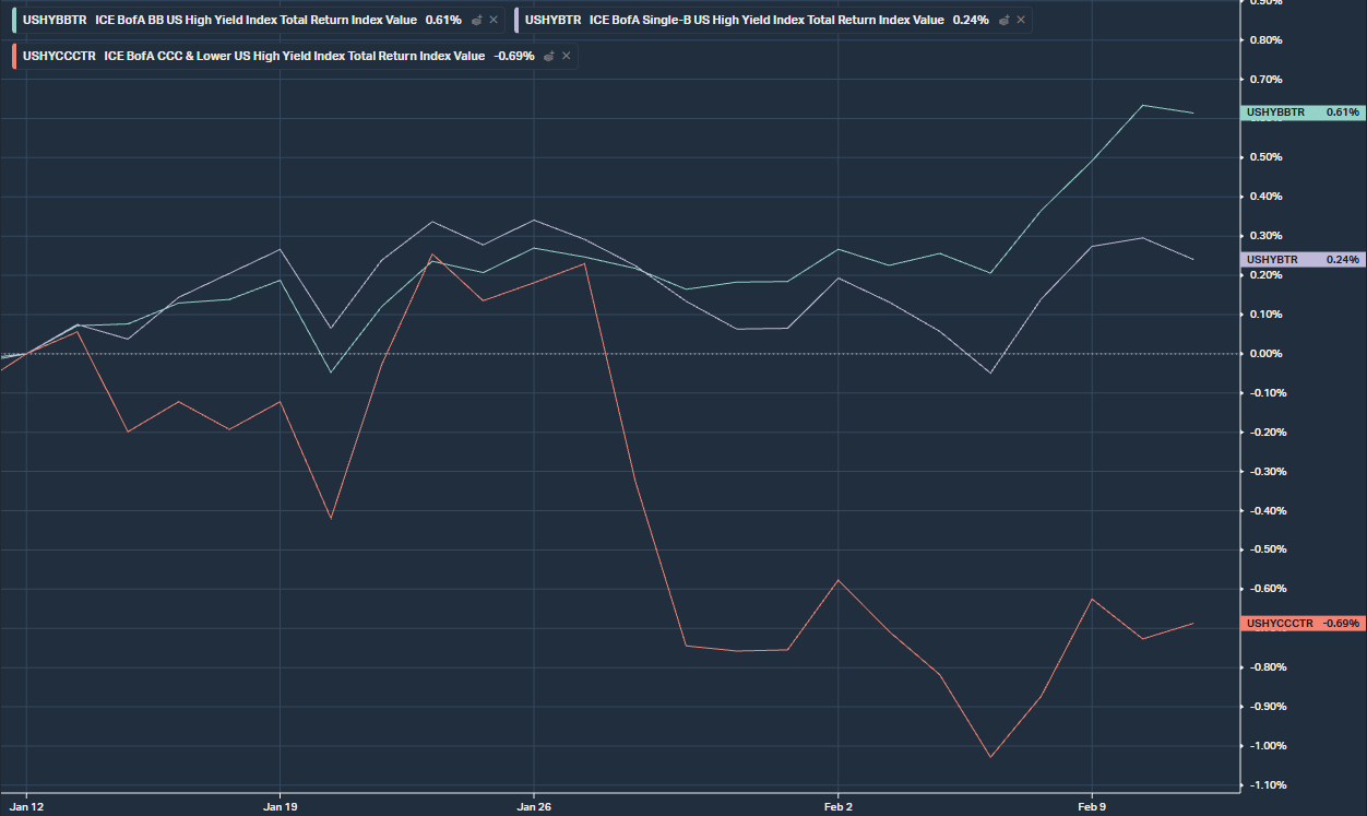 투자 부적격 등급 회사채 가격 차트를 보면 (회사채 금리와 반대) 가장 등급이 낮은 CCC 등급 회사채 가격이 가장 크게 하락했습니다. CCC 등급 회사채는 리스크 선호 심리를 가장 잘 보여줍니다. 1월 말에 CCC 등급 회사채 가격이 크게 하락하고 이후 반등이 지지부진하다면, 하이일드 회사채 금리가 그만큼 높다는 말이죠.