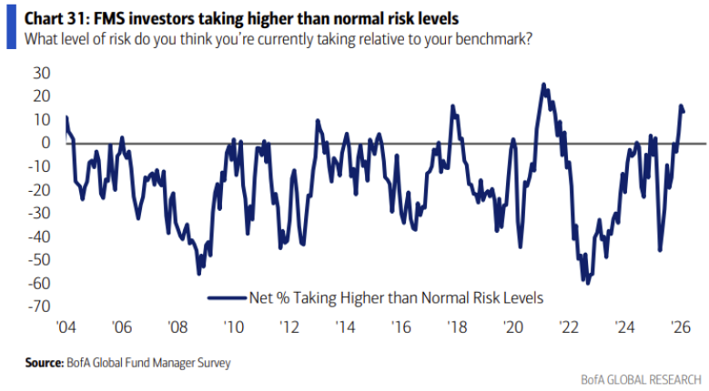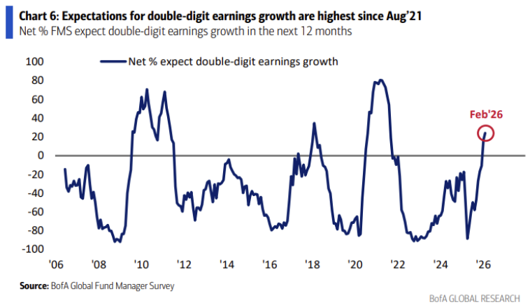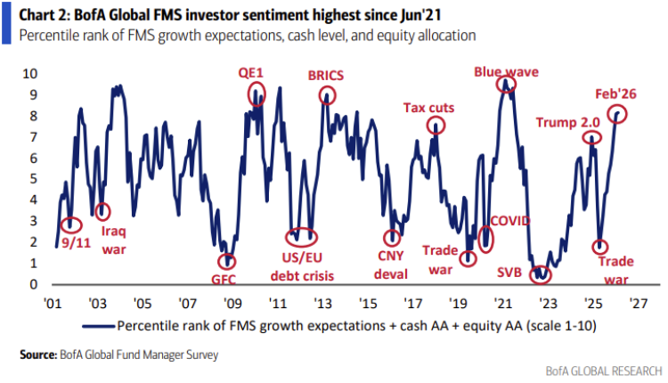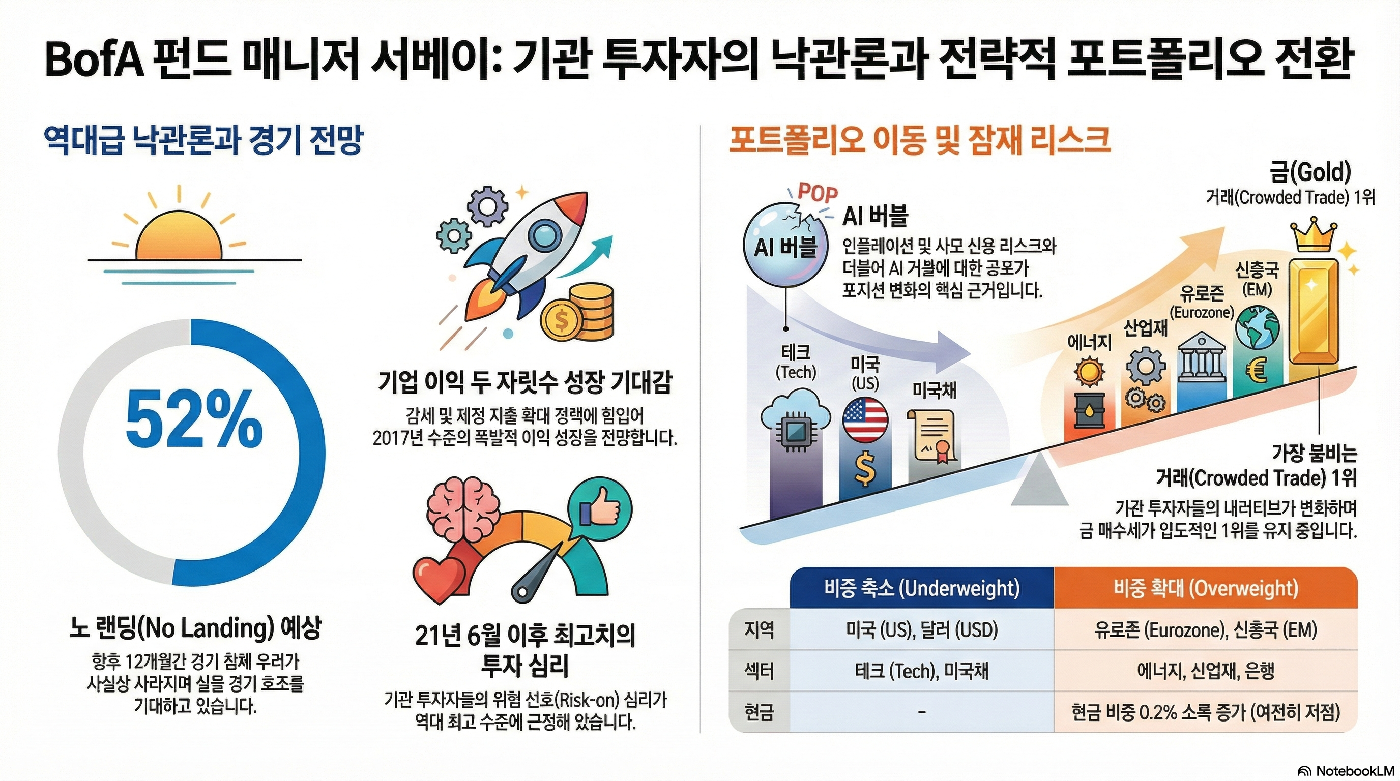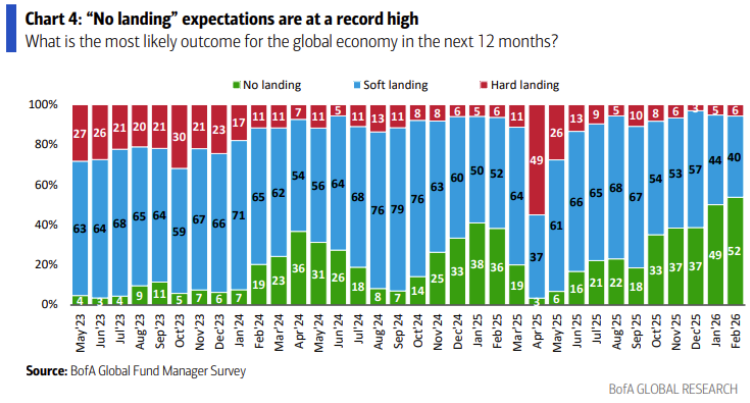 그래도 여전히 기관 투자자들의 향후 실물경기 호조에 대한 기대치는 높아지고 있습니다. 26년 2월 서베이에서 향후 12개월 동안 글로벌 실물경제가 no landing을 보일 것이라는 예상은 무려 과반을 넘은 52%를 기록했습니다. 사실상 경기침체에 대한 우려는 사라진 상태로 보이네요.