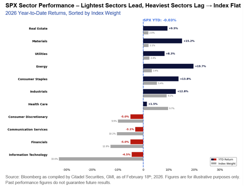 이미 수차례 언급한 것처럼 미국 증시에서는 섹터 로테이션이 작년말부터 계속 이어지고 있습니다. 2026년초부터 현재까지 (Year-to-date : YTD) 섹터 별 수익률을 보면 지수에서 가장 압도적인 비중을 차지하는 IT는 -4.5%의 수익률을 기록했습니다. 지수에서 가장 큰 비중이 마이너스 수익률을 기록한 반면, 상단의 부동산, 소재, 유틸리티, 에너지 등 지수에서 크지 않은 비중을 차지하는 많은 섹터들이 모두 크게 상승했죠.