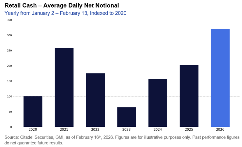 개인 투자자들은 2026년에 들어와 예년에 비해 훨씬 대규모로 주식을 적극적으로 매수하고 있습니다. 위 차트는 1월초부터 2월 중순까지 일평균 개인의 주식 순매수 규모입니다. 작년에 비해서도 개인의 ...