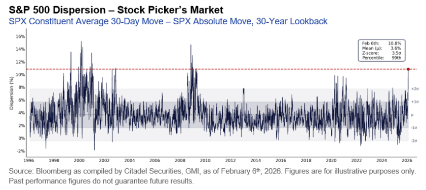 최근의 미국 증시는 지수는 정체되었지만, 종목 단위의 변동성이 큰 시장입니다. 이를 잘 보여주는 것이 확산 (dispersion) 지표인데, 차트에 설명된 것처럼 S&P500 구성종목들의 평균 가격 변동폭과 S&P500 지수의 평균 가격 변동폭의 스프레드입니다. 이 스프레드가 클수록 전체 시장보다 개별종목의 움직임이 활발했다는 의미죠.
