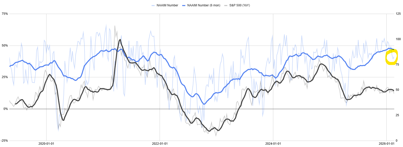 NAAIM 액티브 투자자 주식 노출도... 지난 주에 비해 소폭 높아졌지만, 거의 정체 상태라고 보아야겠습니다. 고점레벨에서 약간 비중을 줄인 수준이 유지되고 있어요.