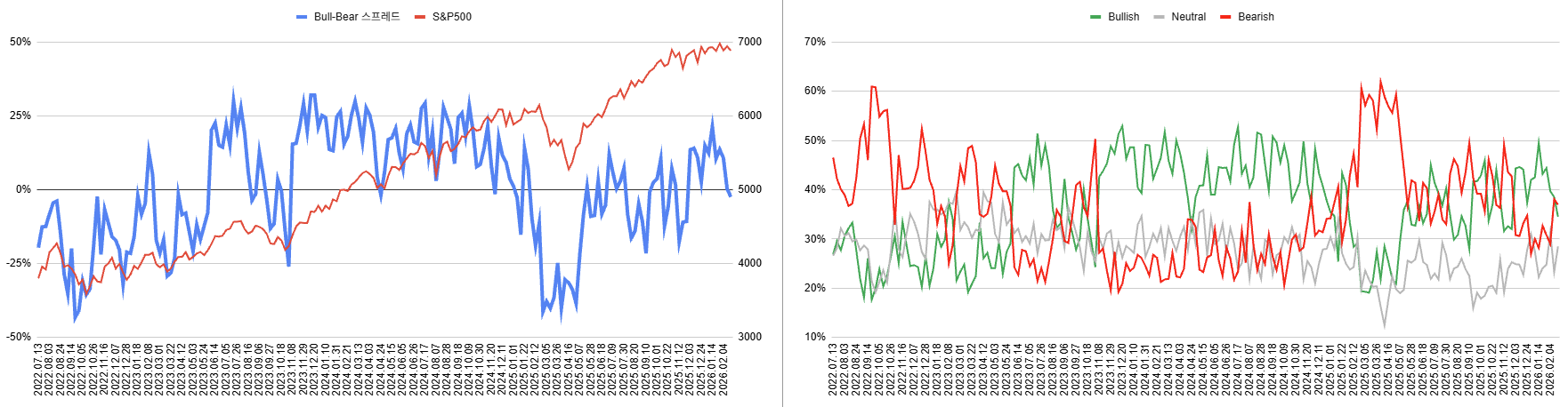 AAII 개인 투자자 심리는 이번 주에 더 부정으로 기울었습니다. Bull-Bear 스프레드가 마이너스로 떨어졌죠. Bullish 비중은 줄고, Bearish 비중은 높아졌습니다.