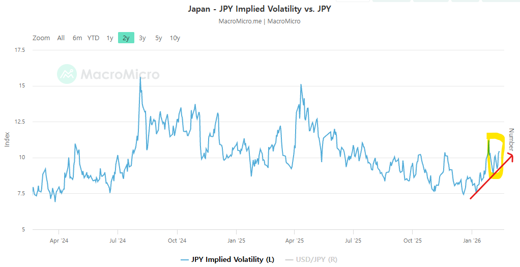 엔 내재 변동성은 이전 아티클을 올렸던 1월말에는 급등하는 모양새였지만 이후 다소 안정되는 모습을 보이고 있습니다 (노란 형광펜). 다만, 여전히 higher low (높아지는 저점) 를 형성하며 엔 변동성은 여전히 상승추세에 놓여있죠 (빨간 화살표).