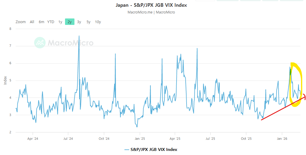 일본국채 VIX도 동일합니다. 1월 말 급등했지만 이후 안정되는 모습을 보였습니다 (노란 형광펜). 하지만, 엔 변동성과 마찬가지로 higher low를 형성하는 상승추세는 이어지고 있죠 (빨간 화살표).