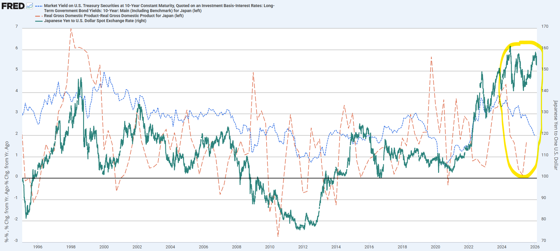 미일 금리차 (파란 점선), 미일 성장률차 (주황 점선), 달러-엔 환율 (초록선) 을 살펴봅시다. 지난 아티클에서 제가 지적했던 부분은 금리차와 성장률차가 줄어들고 있는데도, 달러-엔 환율은 지나치게 높은 수준이라는 거였죠. 한 달 전과 지금... 차이는 거의 없습니다. 여전히 간극은 유지되고 있는 상태죠.