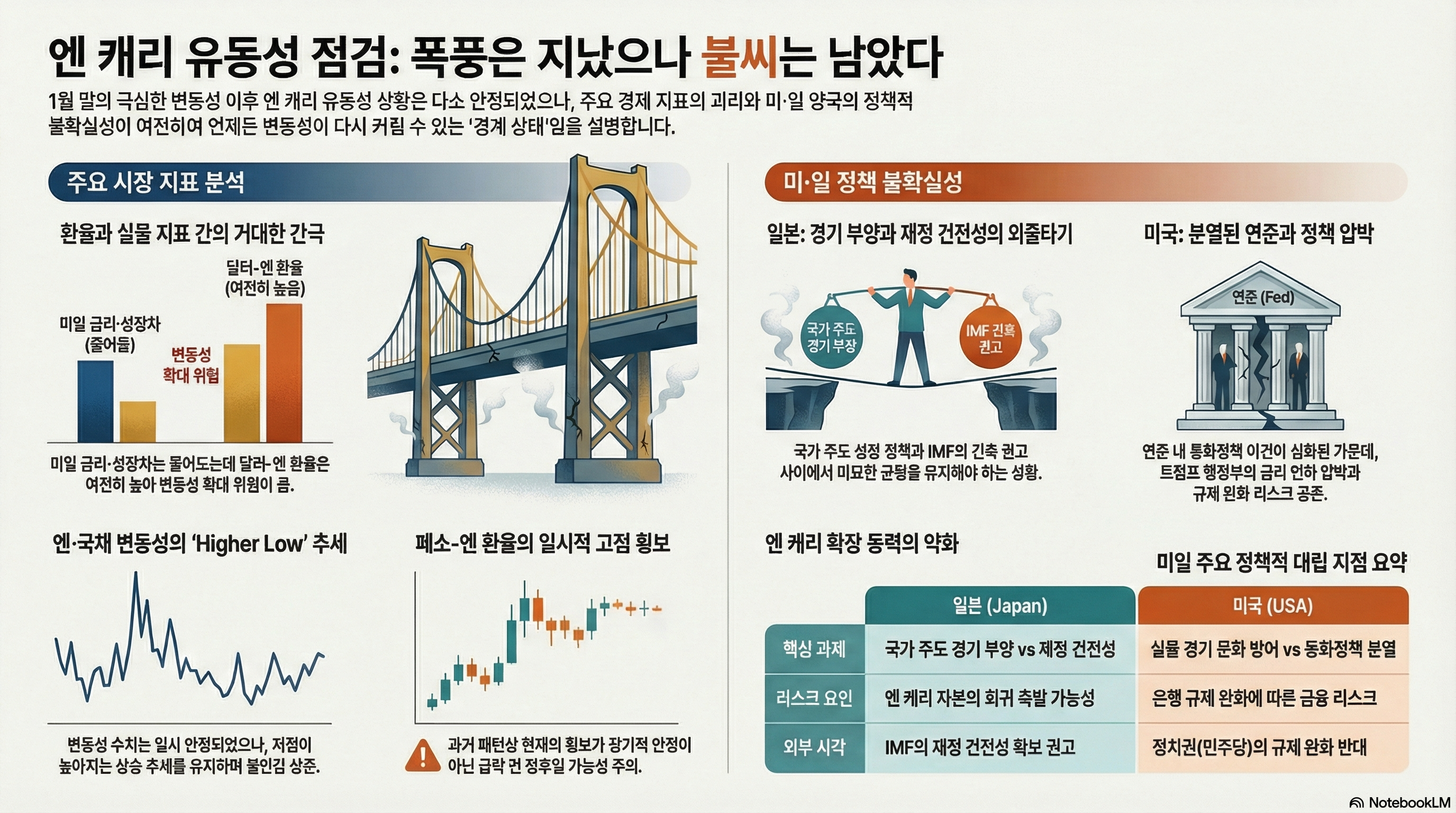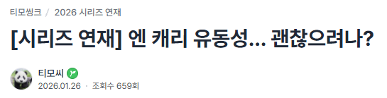 엔과 일본국채의 높아지는 변동성은 평온한 엔, 지루한 엔이라는 엔 캐리의 기본 전제조건을 훼손시킵니다. 1월 말의 변동성 급등은 완화되었기에 당시보다는 상황이 좋아졌지만, 여전히 변동성은 커지는 국면이기에 안심하기는 이르지 않나 생각됩니다.