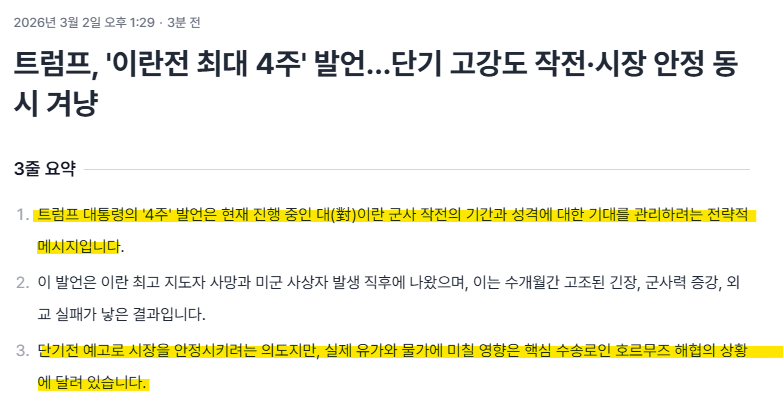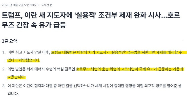 트럼프는 3월 2일 이란의 차기 지도층이 '실용적' 이라면 상황을 해제할 것임을 시사했습니다. '실용적' 이라는 단어의 의미는 '자기 말을 잘 듣는' 으로 해석되죠? 저는 이 발언의 내용보다 발언의 시점과 의도에 더 주목합니다. 이스라엘은 모르겠지만, 적어도 미국은 이번 공습으로 원하는 바를 어느 정도 얻었다고 판단하는 것 같아요. 그리고 사태가 길어지면서 유가가 상승하는 것을 두려워 합니다.