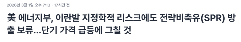 미국이 빠르게 치고나올 계획이었음을 암시하는 또 다른 증거로 저는 에너지 부의 전략 비축유 방출 보류 결정을 들겠습니다. 실시간 내러티브에 해설된 대로 이 결정은 OPEC+의 증산 결정과 같은 다른 완충장치에 대한 기대 내지는 최후의 수단으로 아껴두고자 내린 결정이라고 볼 수 있죠. 하지만, 저는 이 결정에 사태를 조기에 종식시키려는 행정부의 의도가 숨어있다고 봅니다. 유류비 상승에 의한 소비자 물가 상승에 영향을 미칠 수 있는 상황을 길게 끌고 가고싶을 리가 없겠죠.